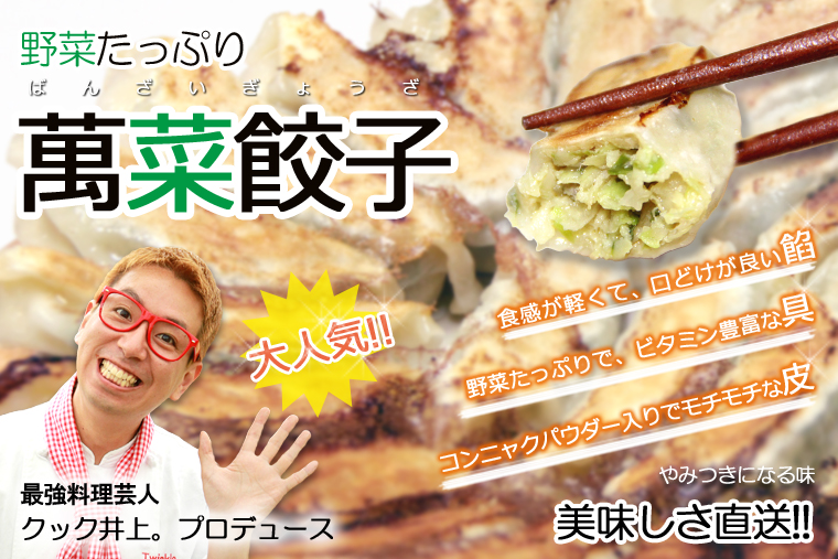 モチモチの皮に、野菜たっぷりで隠し味も含まれた餡で仕上げた萬菜餃子(ばんざいぎょうざ)。最強料理芸人のクック井上氏がプロデュースしたこの餃子は、お母さんの味をベースに、研究に研究を重ねたクックさんの自信作。実際食べてみて誇大広告ではない事は一食瞭然。ビールがあると10個20個気がつくとなくなっているほど。失敗しない焼き方含め、まとめてみました。クック井上氏はお笑いコンビ「ツインクル」のツッコミ担当。バラエティや料理番組で数多くの優勝経験がある実力派芸人です。