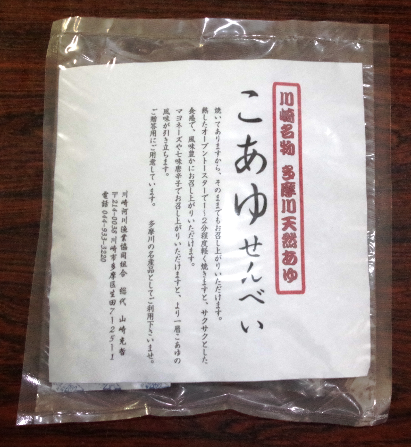 多摩川産のアユをつかった「こあゆせんべい」が発売されました。多摩川鮎は江戸時代には名産品として幕府にも上納されていたそうですが、その後水質汚染により壊滅状態の時もありました。しかしその後の水質改善等の取り組みにより、ここ数年劇的に改善し、多くの鮎が収穫されるようになりました。「多摩川再生のシンボル」としての鮎を使った商品がでてくるのは感慨深いものがあります(K)