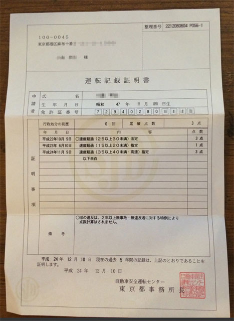 うっかり過失で交通違反をしてしまい、警察から点数を頂いてしまった場合、過去3年間の累積点数が6点以上になると行政処分による免停(免許停止)になります。ただ過去1年間無事故無違反で過ごせれば累積点数も前歴も0に戻ることから、違反歴がある方は具体的にいつどのような違反をしたのかを知っておきたいところです。このような違反記録は自動車安全運転センターに申請することで「運転記録証明書」という形で取得する事ができます。ここではこの証明書を取得するために必要な情報をまとめました。